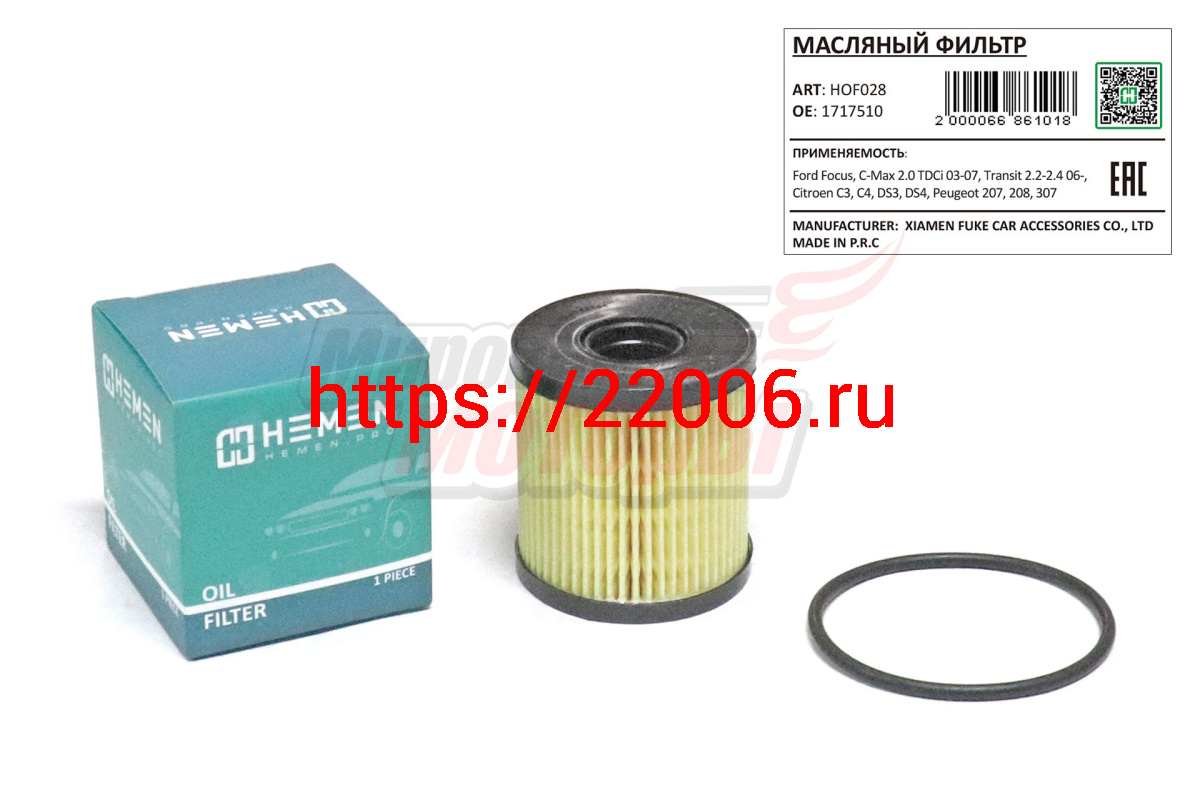 - Фильтр масляный Ford Focus, C-Max 2.0 TDCi 03-07, Transit 2.2-2.4 06-, Citroen C3, C4, DS3, DS4, Peugeot 207, 208, 307 (HOF028) в Челябинске недорого